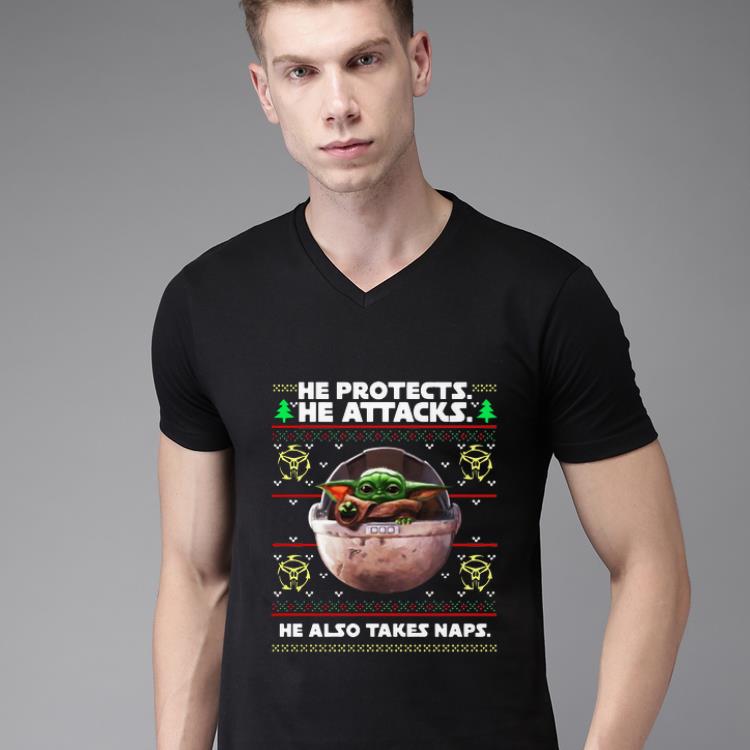 Top Baby Yoda he protects he attacks he also takes naps ugly christmas shirt, Hoodie, Sweater, Longsleeve T-Shirt For Men and Women